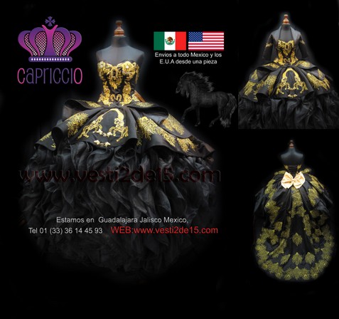 Para este 2026, el vestido de quinceañera color negro con bordados dorados se posiciona como una opción destacada. El negro aporta elegancia y fuerza, mientras que los bordados dorados resaltan el trabajo artesanal inspirado en la cultura charra y los símbolos ecuestres.