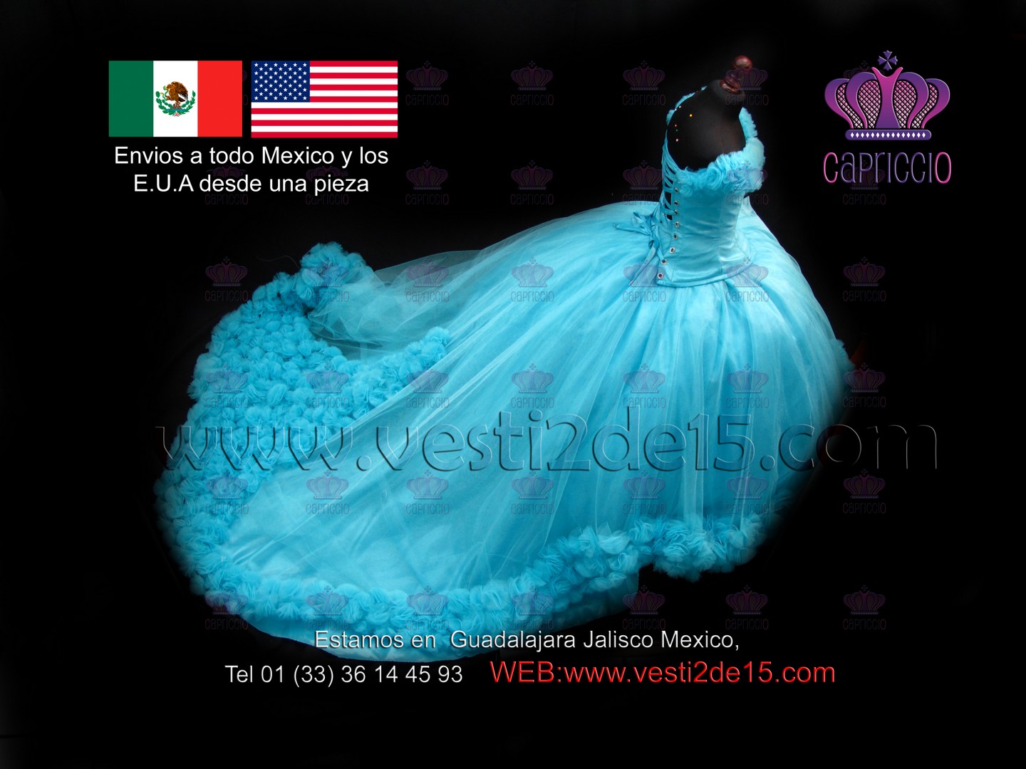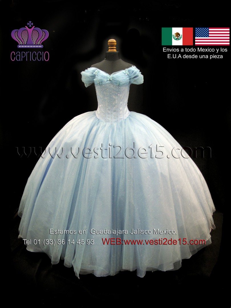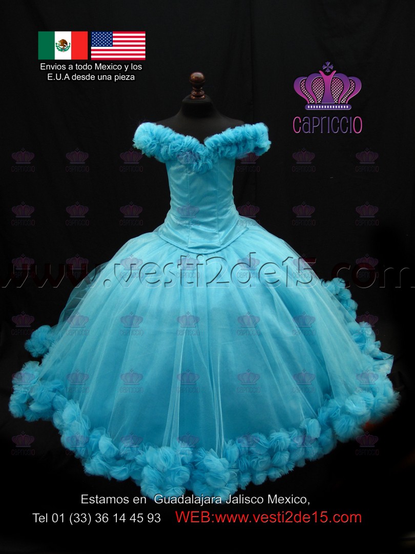 Descripción: Es un vestido para quinceañera tipo princesa en color azul con rosa pastel este tipo de vestido es para la chicas mas extravagantes que les gusta el Glamour!!