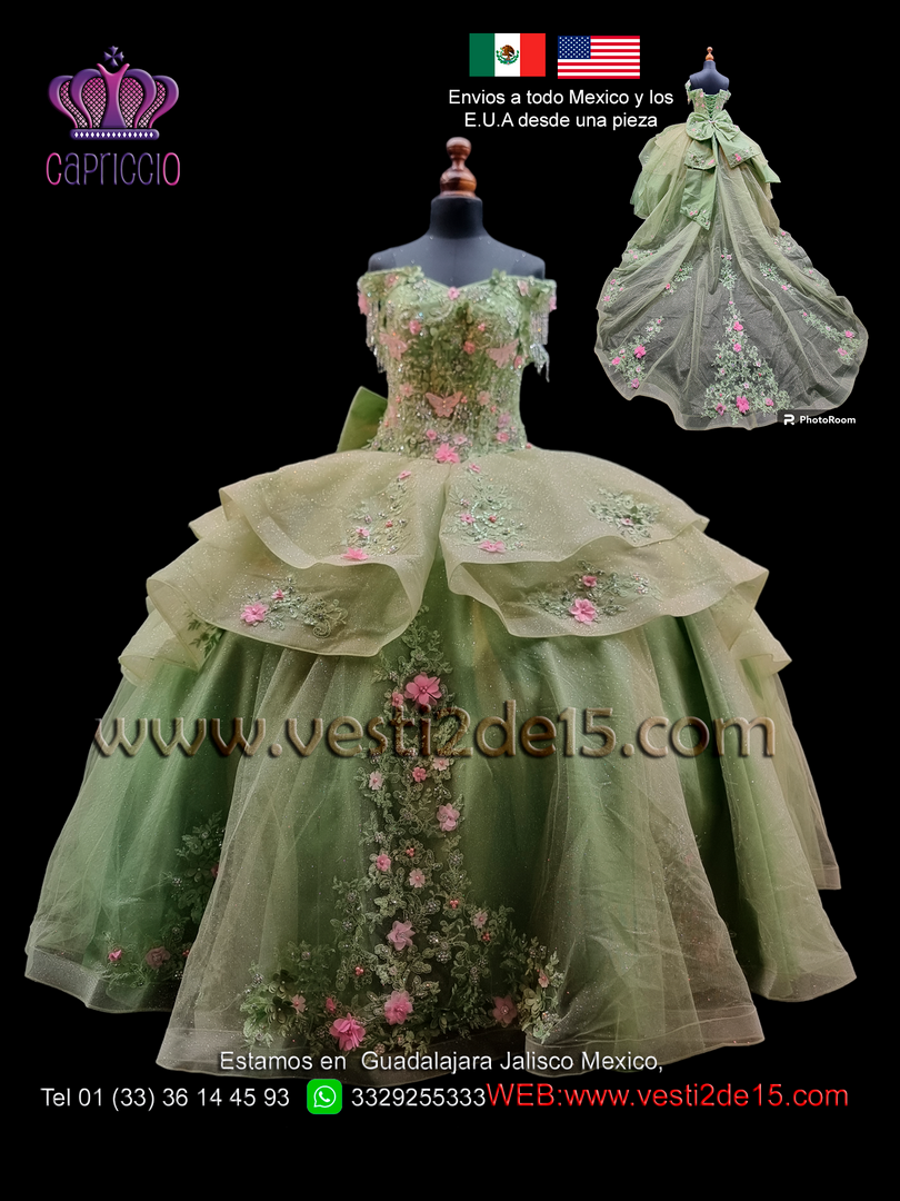 Descripción: Vestido para quinceañera en color esmeralda con decoraciones en encajes al tono